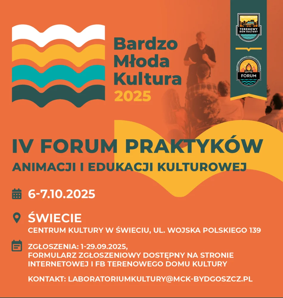 Miejskie Centrum Kultury w Bydgoszczy zaprasza na IV Forum Praktyków Animacji i Edukacji Kulturowej realizowane w ramach programu Bardzo Młoda Kultura Kujawsko-Pomorskie 2023-2025. W tym roku Forum odbędzie się 6-7 października w Centrum Kultury w Świeciu.