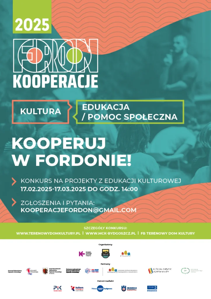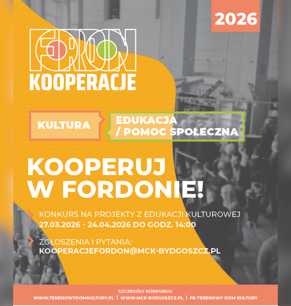 Miejskie Centrum Kultury w Bydgoszczy zaprasza do udziału w piątej edycji programu Kooperacje-Fordon, skierowanego do osób i instytucji z Fordonu (i nie tylko), które mają pomysł na kreatywne i twórcze przedsięwzięcia z zakresu edukacji i animacji kulturowej dla dzieci i młodzieży z Fordonu.