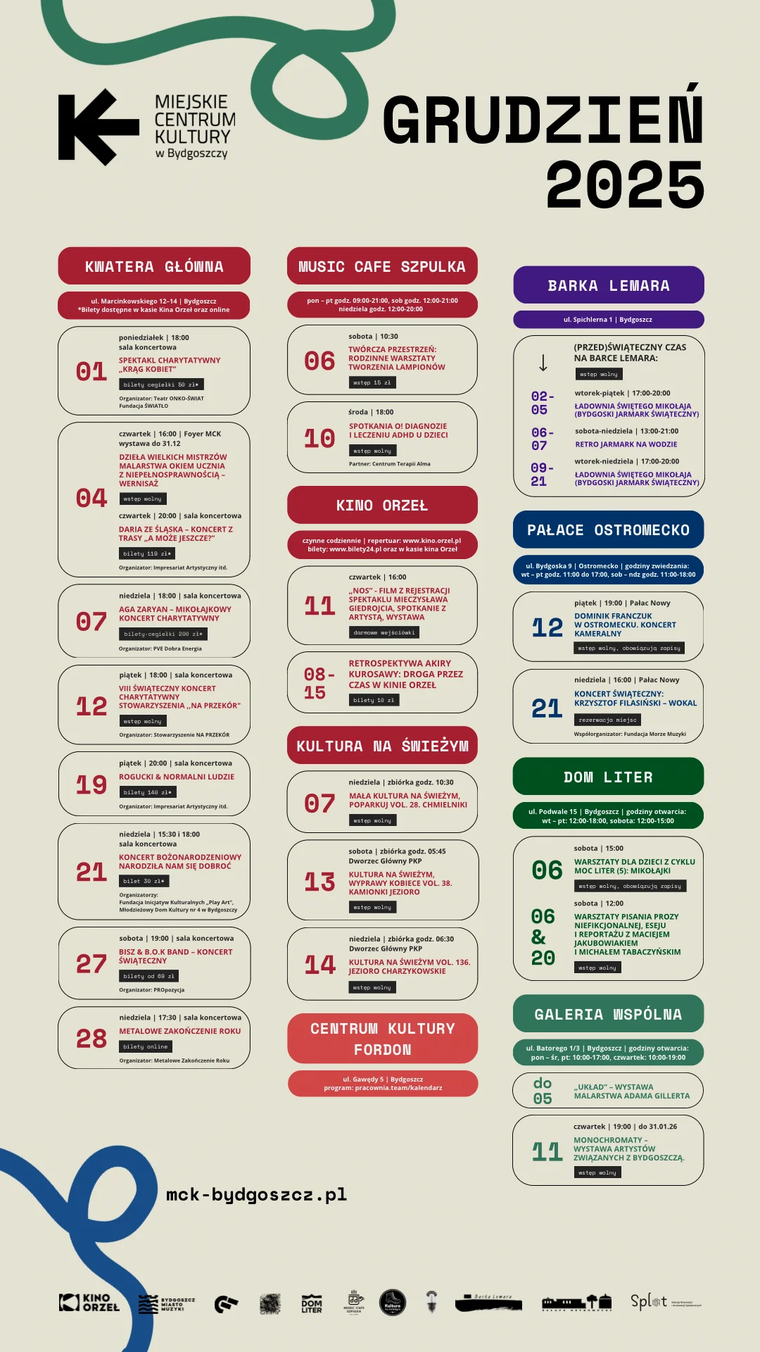 Zapraszamy do zapoznania się z programem wydarzeń Miejskiego Centrum Kultury w Bydgoszczy na grudzień 2025 – sprawdź, co przygotowaliśmy!