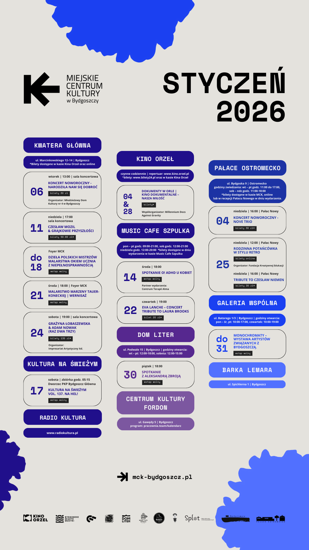 Zapraszamy do zapoznania się z programem wydarzeń Miejskiego Centrum Kultury w Bydgoszczy na styczeń 2026 – sprawdź, co przygotowaliśmy!