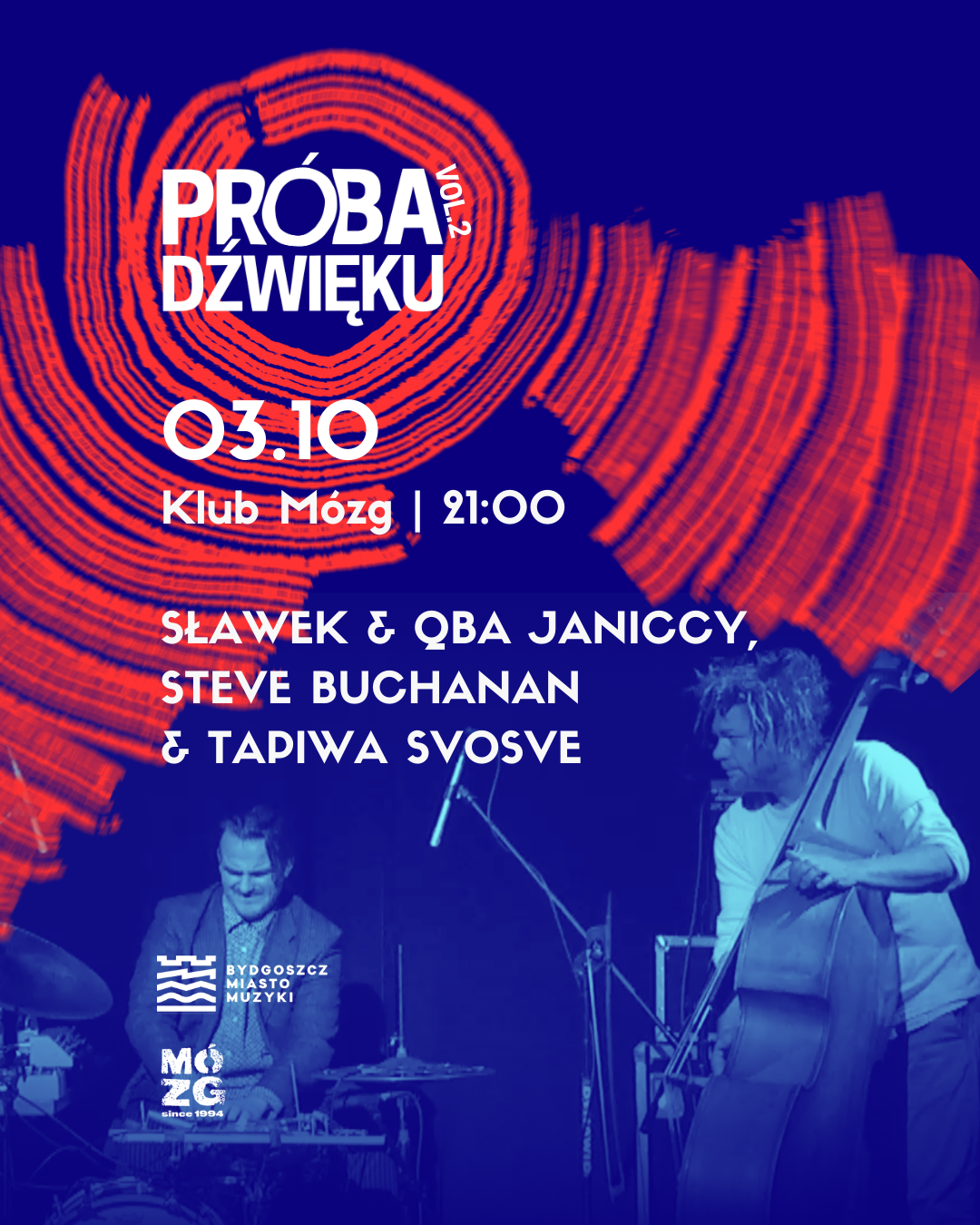Gospodarze bydgoskiego Mózgu – Sławek i Qba Janiccy – spotkają się na scenie z niezwykłym szwajcarsko-amerykańskim duetem: Stevem Buchananem i Tapiwą Svosve. Artyści wystąpią w duetach i w kwartecie, a wieczór wypełni czysty eksperyment – muzyka balansująca między improwizacją, noise’em, elektroakustycznymi strukturami i niespodziewanymi brzmieniami. To będzie okazja do doświadczenia dźwięków, których wcześniej nie słyszeliście.